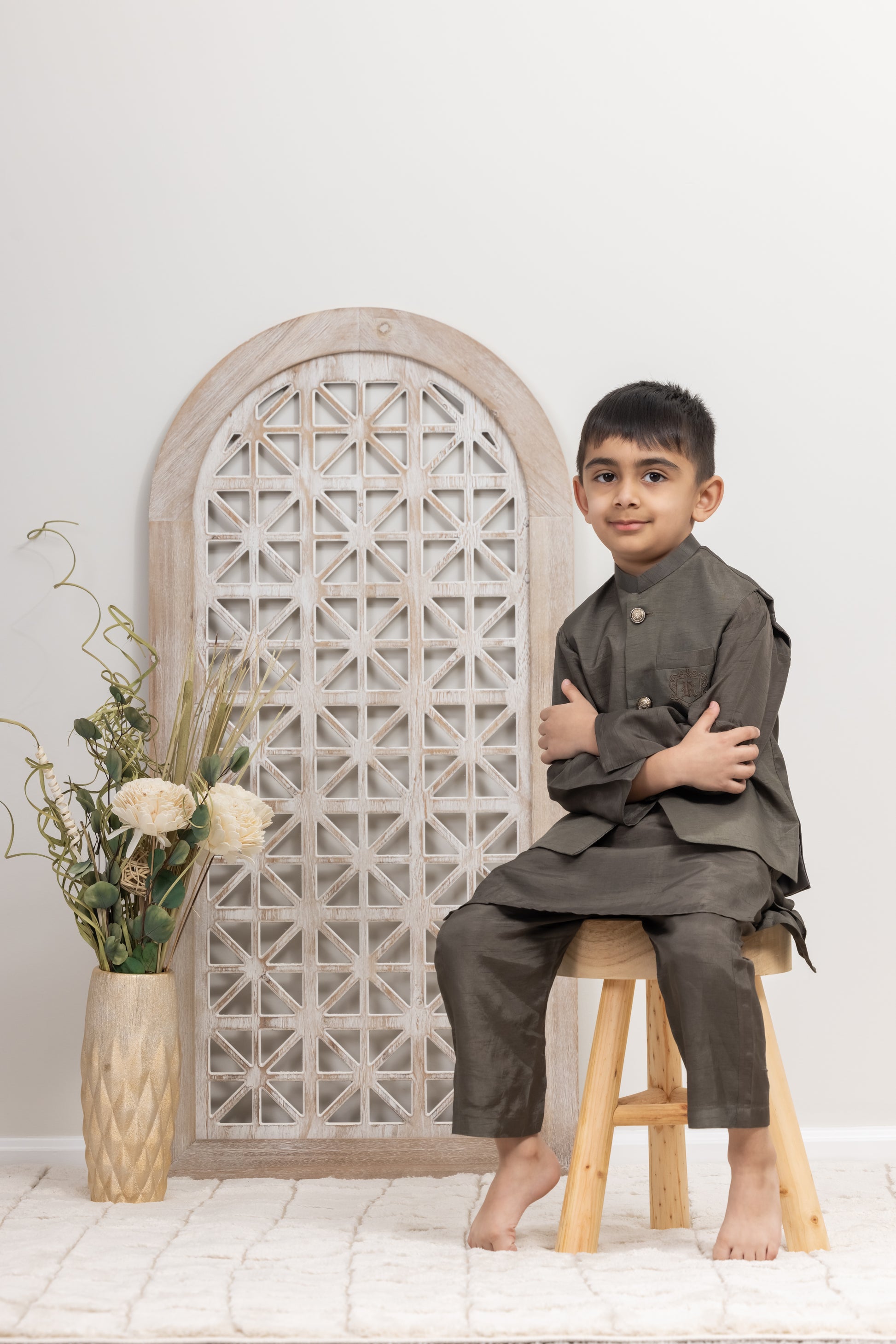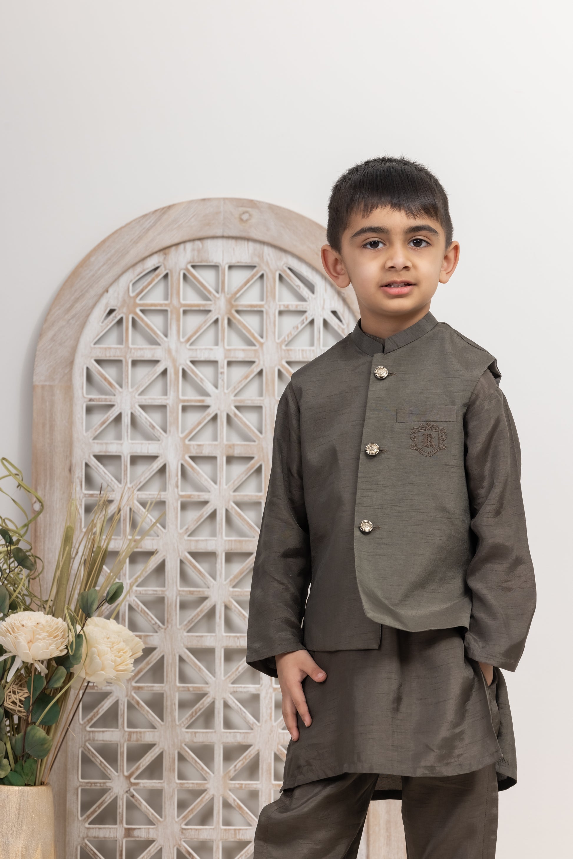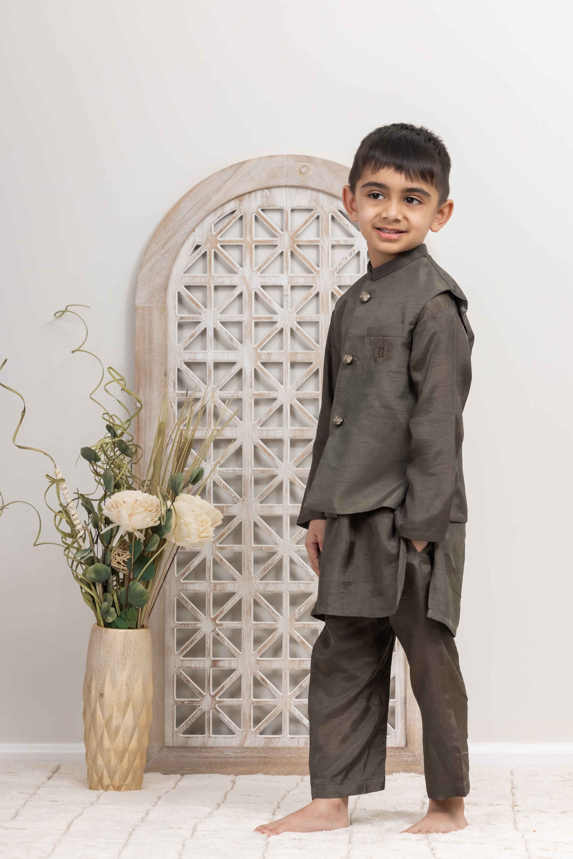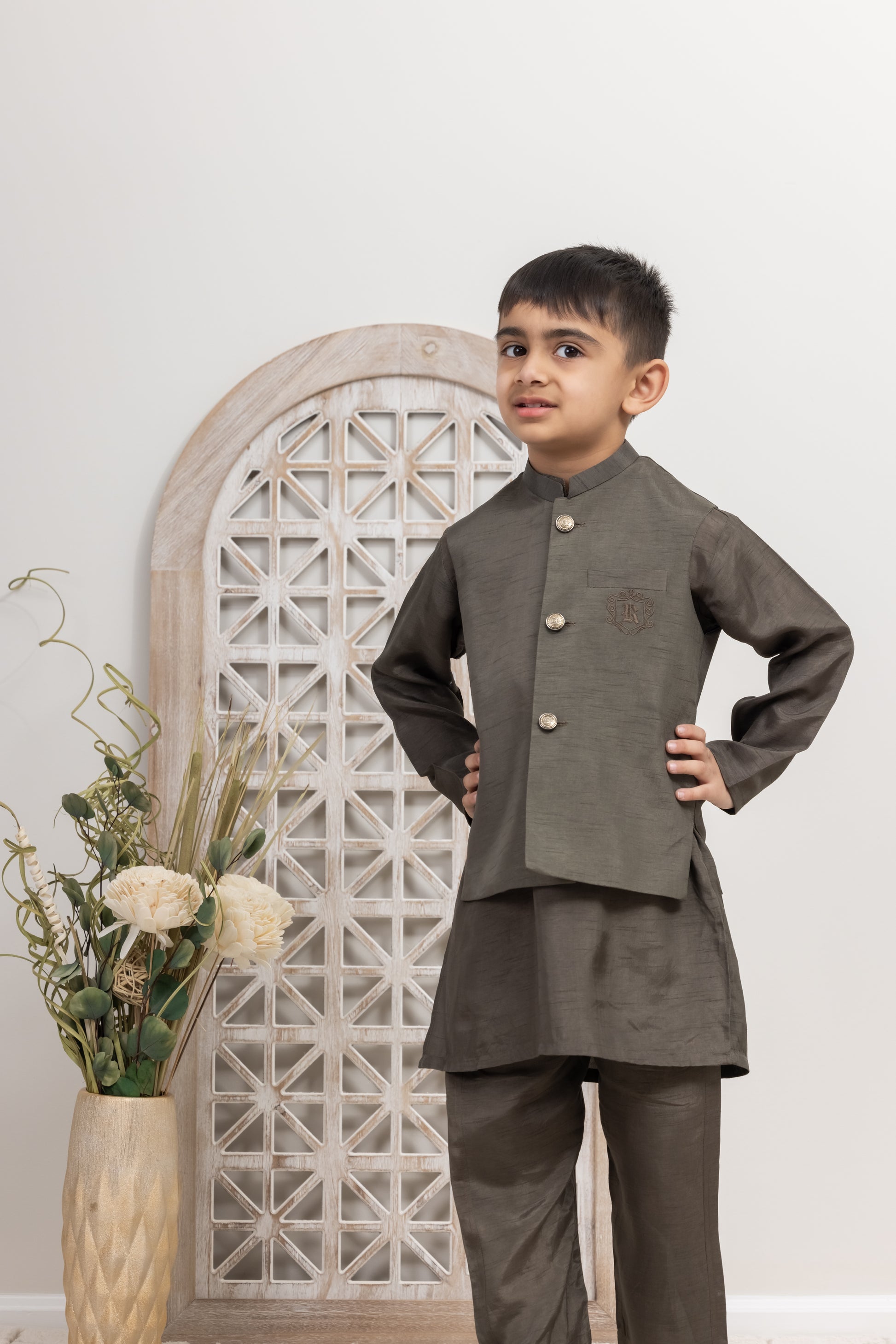 This Deep siege Raw-silk 3 piece suit with 2 functional pockets. Give the kids traditional look for any event. This piece have a blended fabric and easy to wear. No-itch collar and sleeves with Wide neck to easily fit over baby's head. Every size can cover age gape (For Example: 6 yrs old can wear between 5yrs - 6yrs Or 6 yrs Old can wear 6yrs - 7 yrs depend on the height and width)