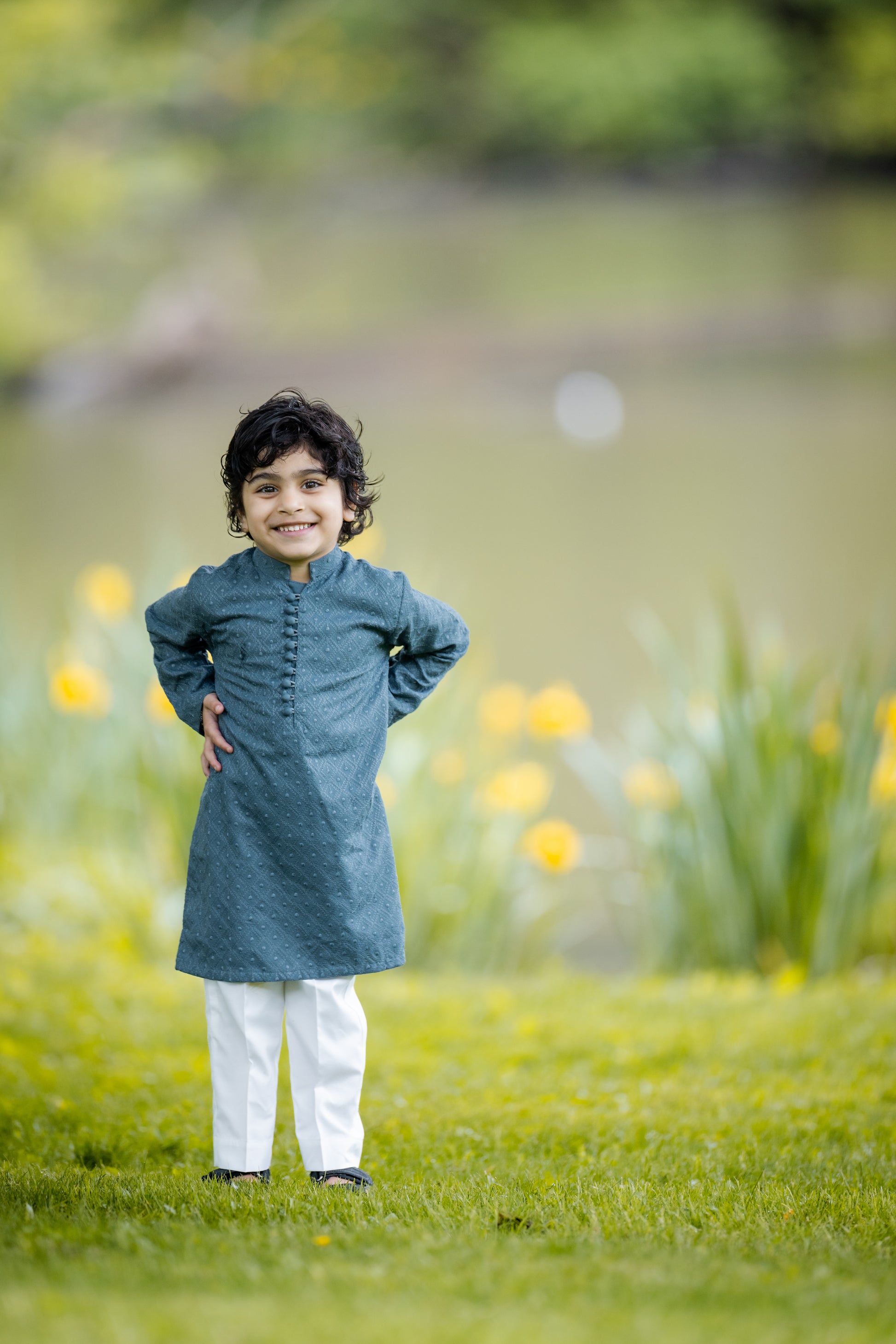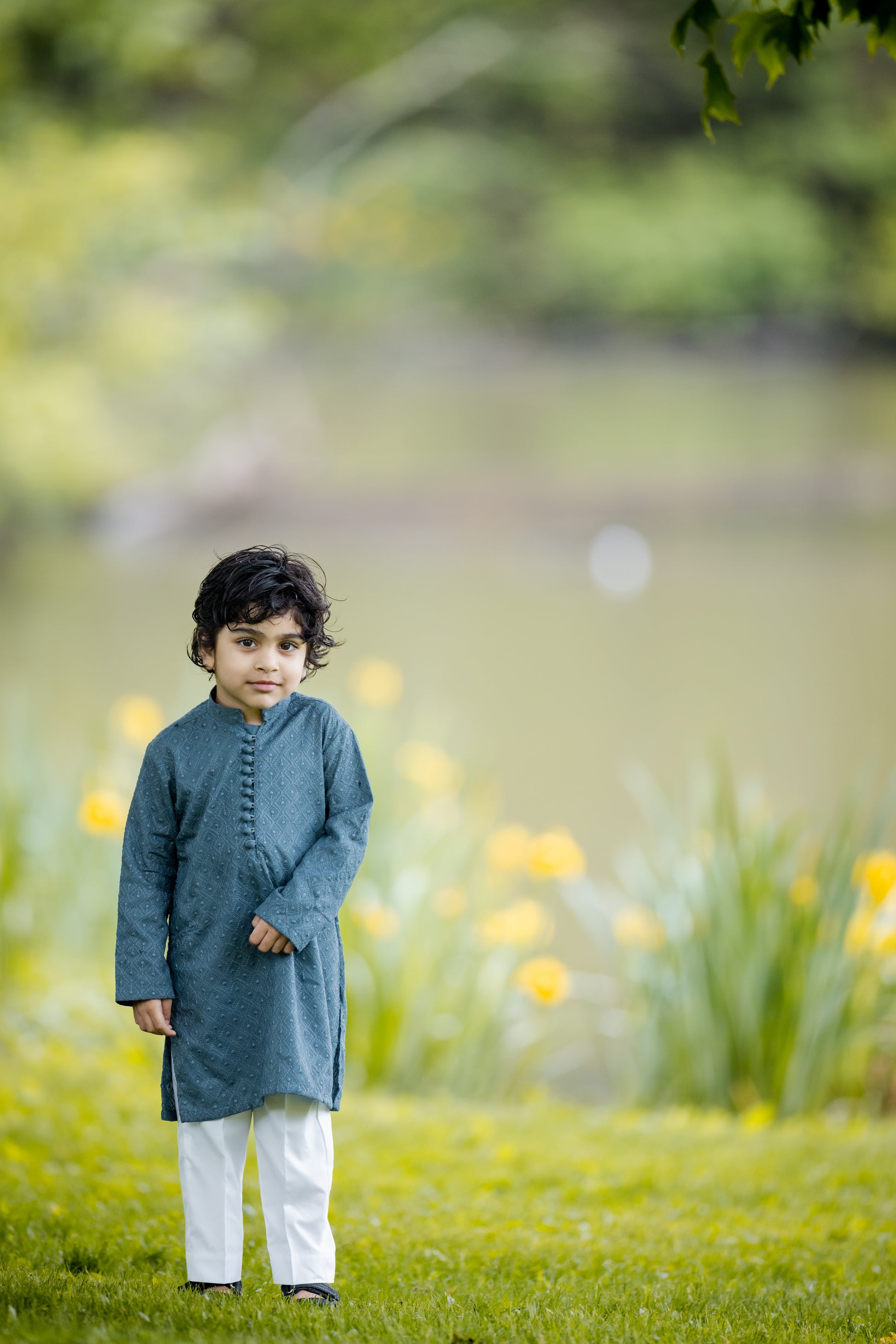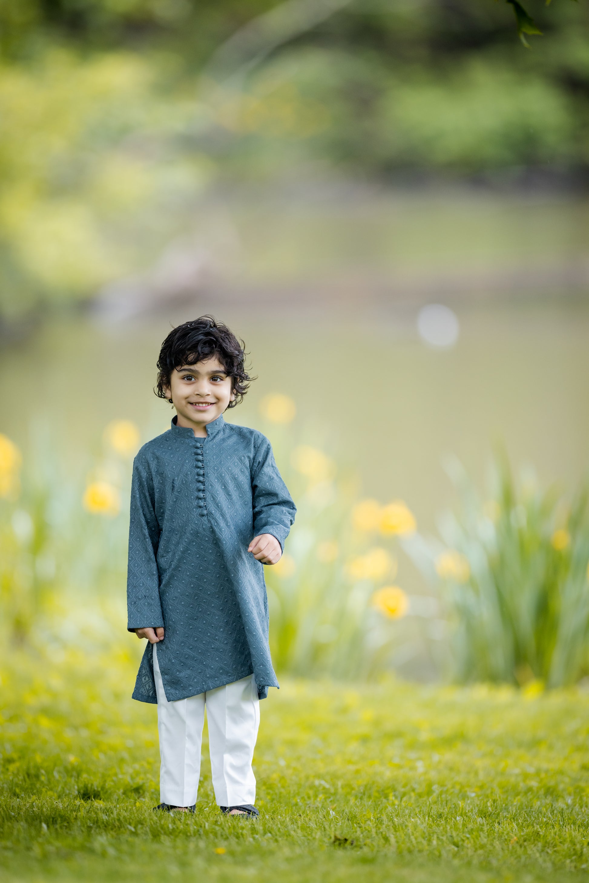This Anzal Kurta has extra Ordinary Bluish green Color. Give the kids traditional look for any event. No-itch collar and sleeves with Wide neck to easily fit over baby's head.