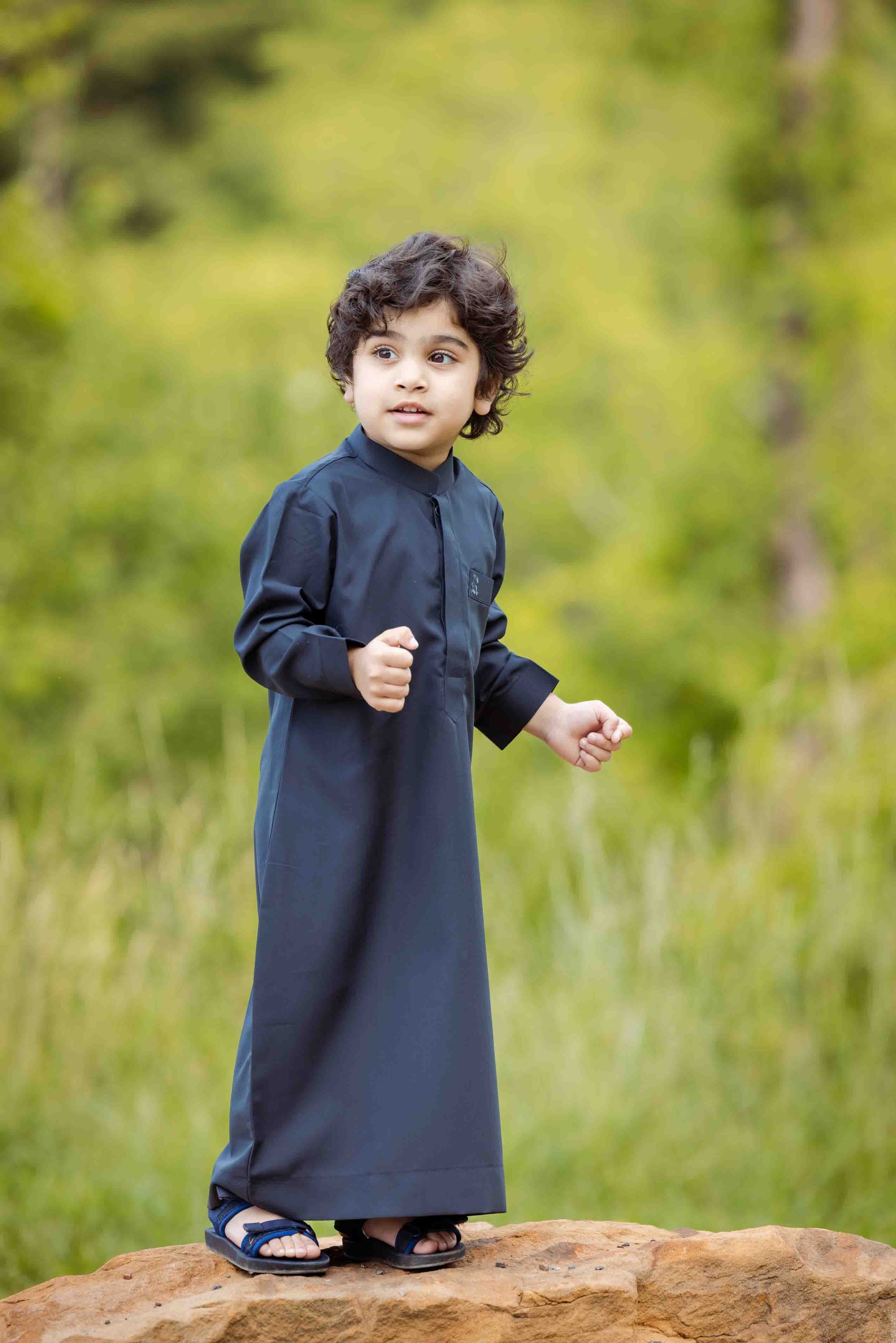 The Navy Blue Thobe is a traditional Middle Eastern garment for boys, commonly worn for special occasions like weddings or religious ceremonies. Resembling a long shirt that reaches the ankles, this garment is typically made of cotton or silk and is available in infant and kids sizes. Consult the size chart to ensure the correct fit. This item is ready to ship and should be hand washed only. Currently, it is being worn by little boys who are 3 years old and wearing a size 3.