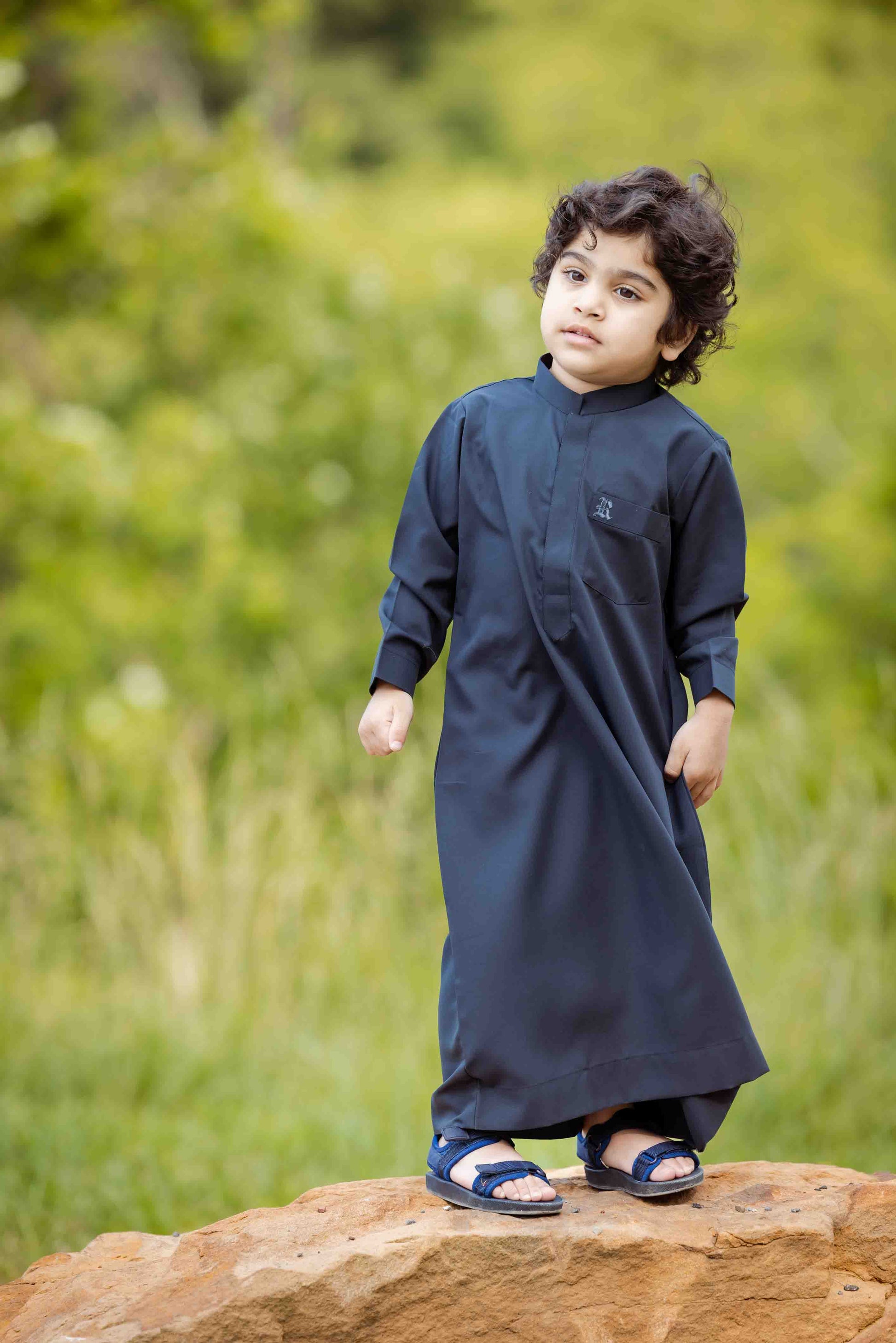 The Navy Blue Thobe is a traditional Middle Eastern garment for boys, commonly worn for special occasions like weddings or religious ceremonies. Resembling a long shirt that reaches the ankles, this garment is typically made of cotton or silk and is available in infant and kids sizes. Consult the size chart to ensure the correct fit. This item is ready to ship and should be hand washed only. Currently, it is being worn by little boys who are 3 years old and wearing a size 3.