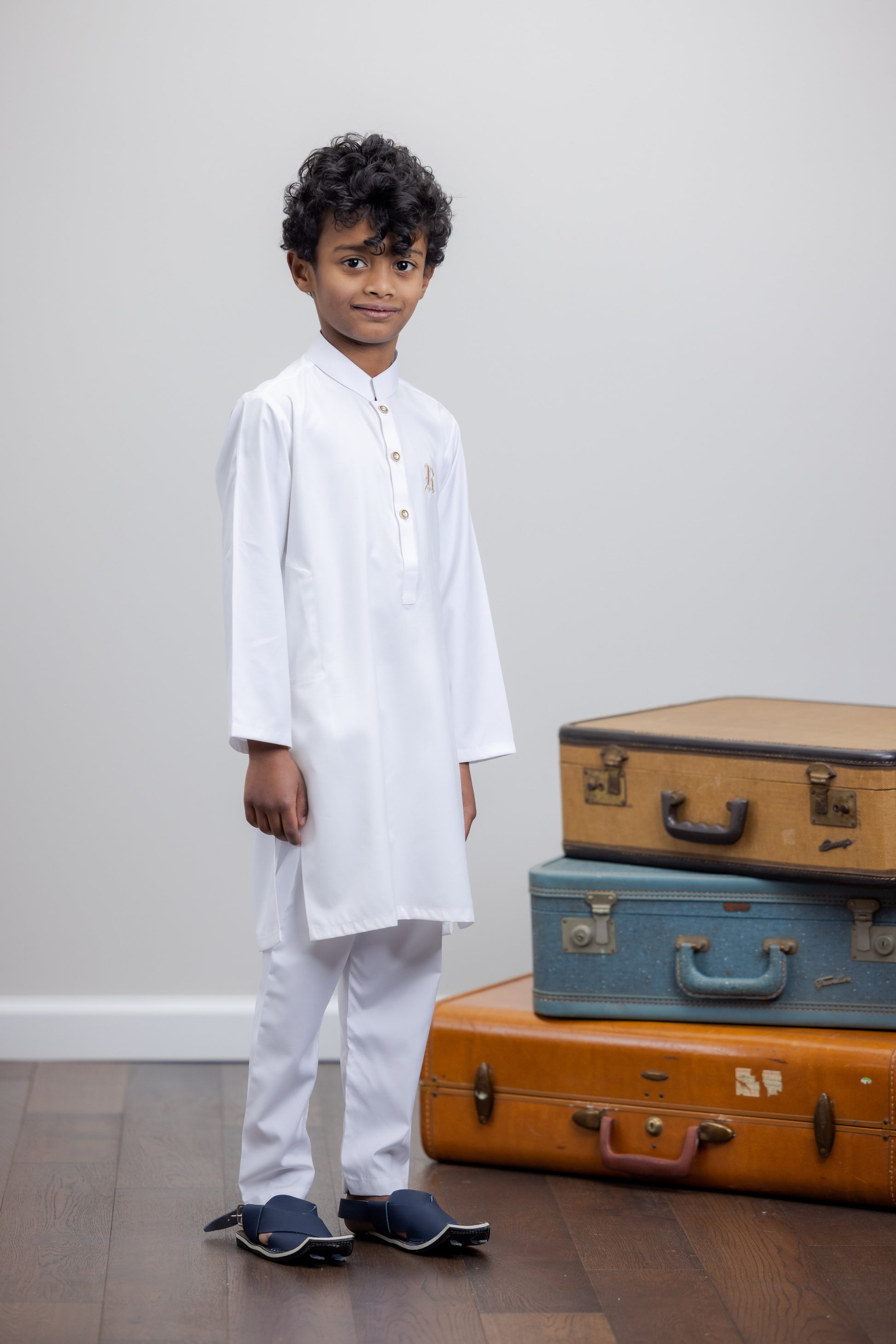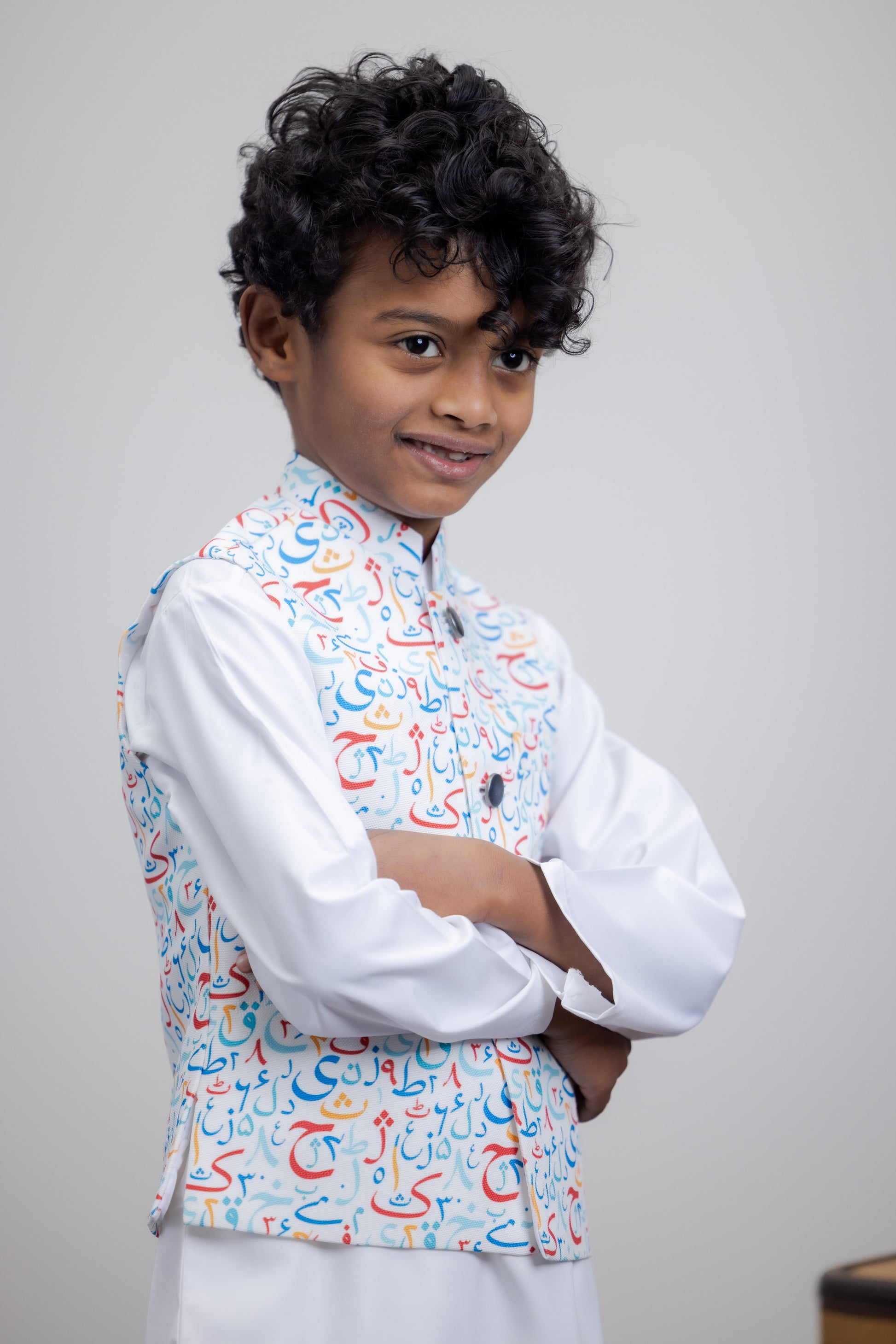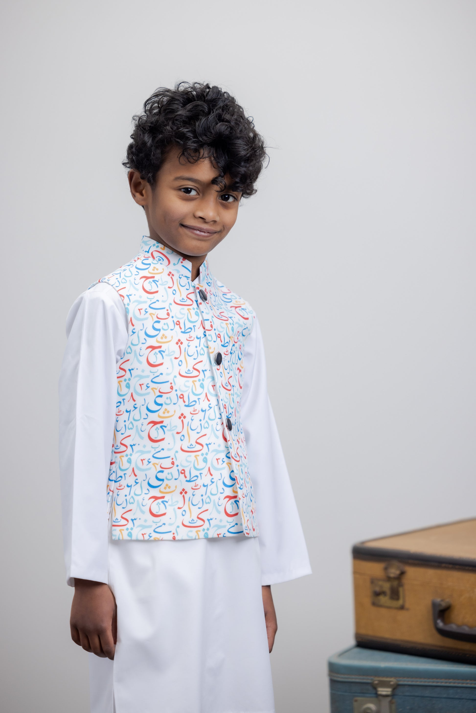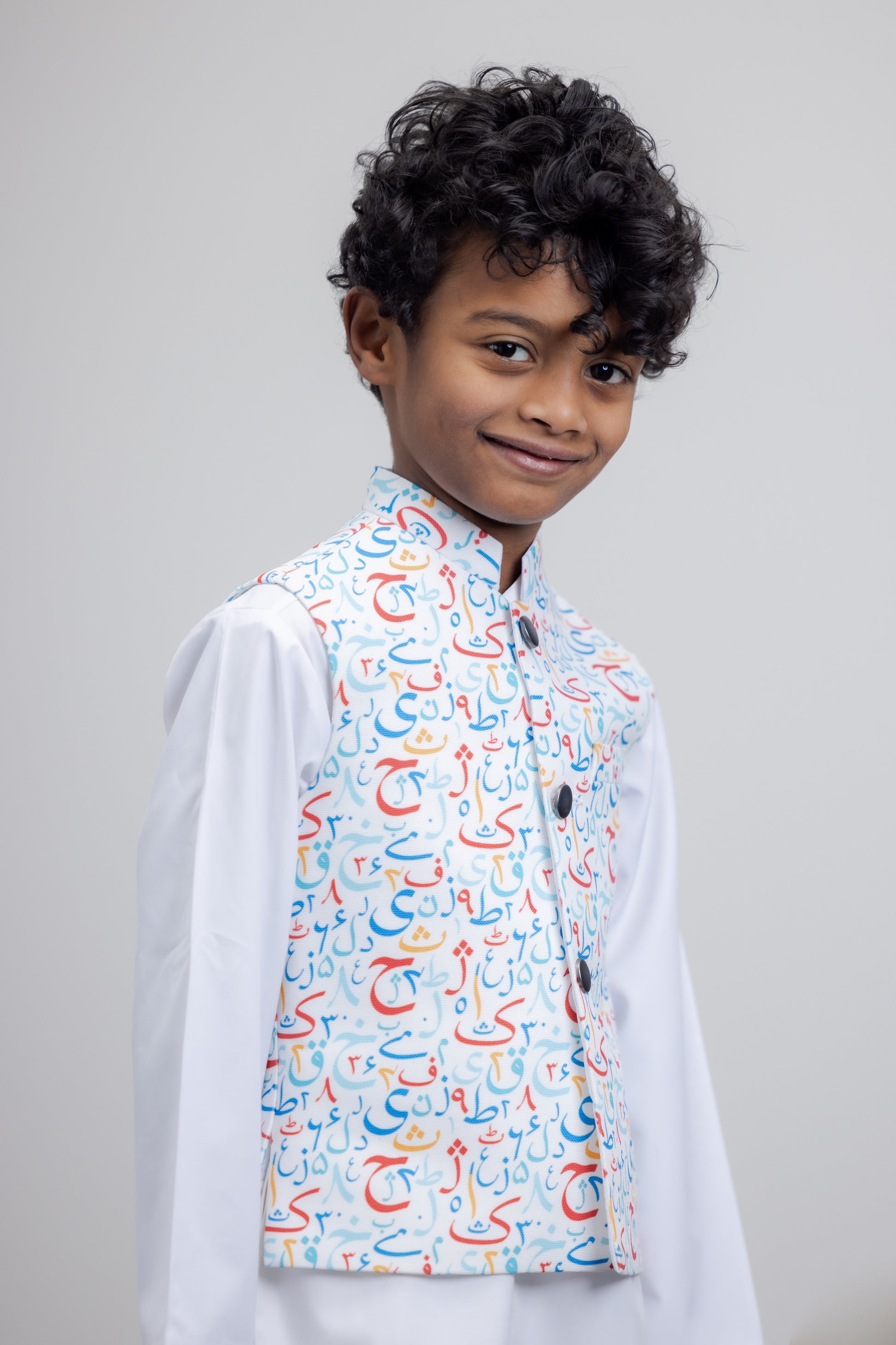 This 2 piece suit can be wore with Urdu alphabet vest along with 2 functional pockets. Give the kids traditional look for any event. This piece have a blended fabric and easy to wear. No-itch collar and sleeves with Wide neck to easily fit over baby's head.